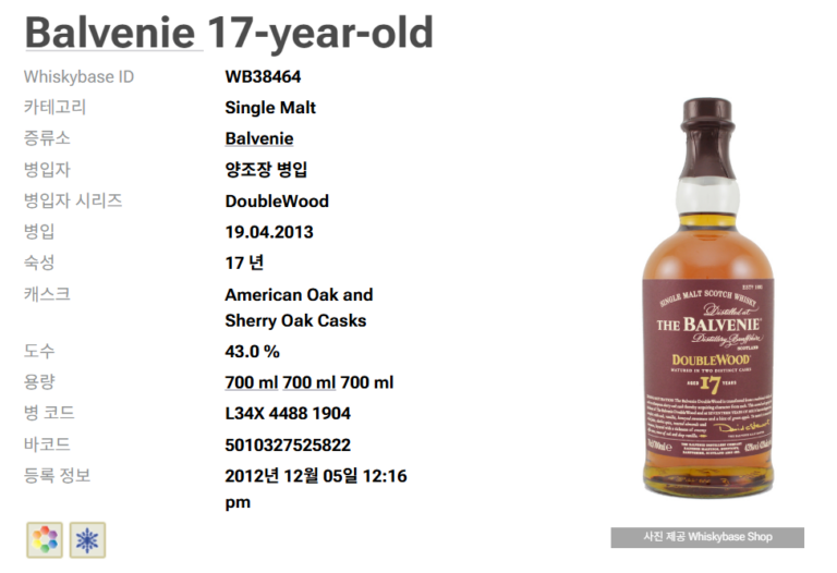 이제는 시중에서 찾아보기 힘든, 그래서 더 애틋한 전설의 라인업입니다. 12년 더블우드의 큰 형님 격으로 출시되었으나, 현재는 단종되어 컬렉터들 사이에서 비싼 가격에 거래되곤 하죠. 12년 제품과 같은 방식으로 버번 캐스크와 셰리 캐스크를 거쳤지만, 5년이라는 시간의 차이는 생각보다 거대합니다. 12년이 가볍고 경쾌한 꿀맛이라면, 17년은 묵직하고 깊은 ‘조청’ 같은 단맛과 함께 오크의 복합적인 스파이시함이 훨씬 도드라져요. 발베니 팬들 사이에서는 “가장 발베니다운 균형미를 가졌던 술”로 회자되며, 지금도 올드 보틀 샵이나 위스키 바에서 발견한다면 무조건 한 잔 마셔봐야 할 목록 1순위에 오르곤 합니다.